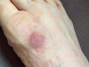 I noticed it growing after a couple weeks of walking. Very small at first. I had a little experience with one before. Possibly even in the same location. And that would make sense as to why this came back because once they form, the bubble never really goes away. Just gets more or less filled with fluid. An as needed scenario. As I was approaching Leon, it had become so large that I was having with my footwear. And so painful that I skipped a stage and went straight to Leon by train. By the time I reached the correct hospital, I was literally dragging my foot behind me as I could put no weight on it. The cyst had become infected and the infection had begun to spread across the top of my foot. I ended up having to stay in Leon for about a week to heal before I could continue my Camino.